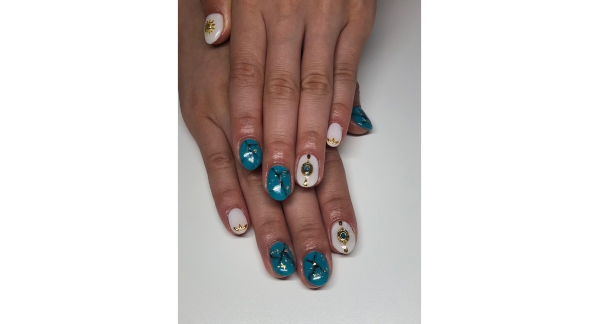 夏っぽくターコイズに大理石風のアートをして、乳白色のワンカラーのところには、ゴールドのスタッズをおきました!!